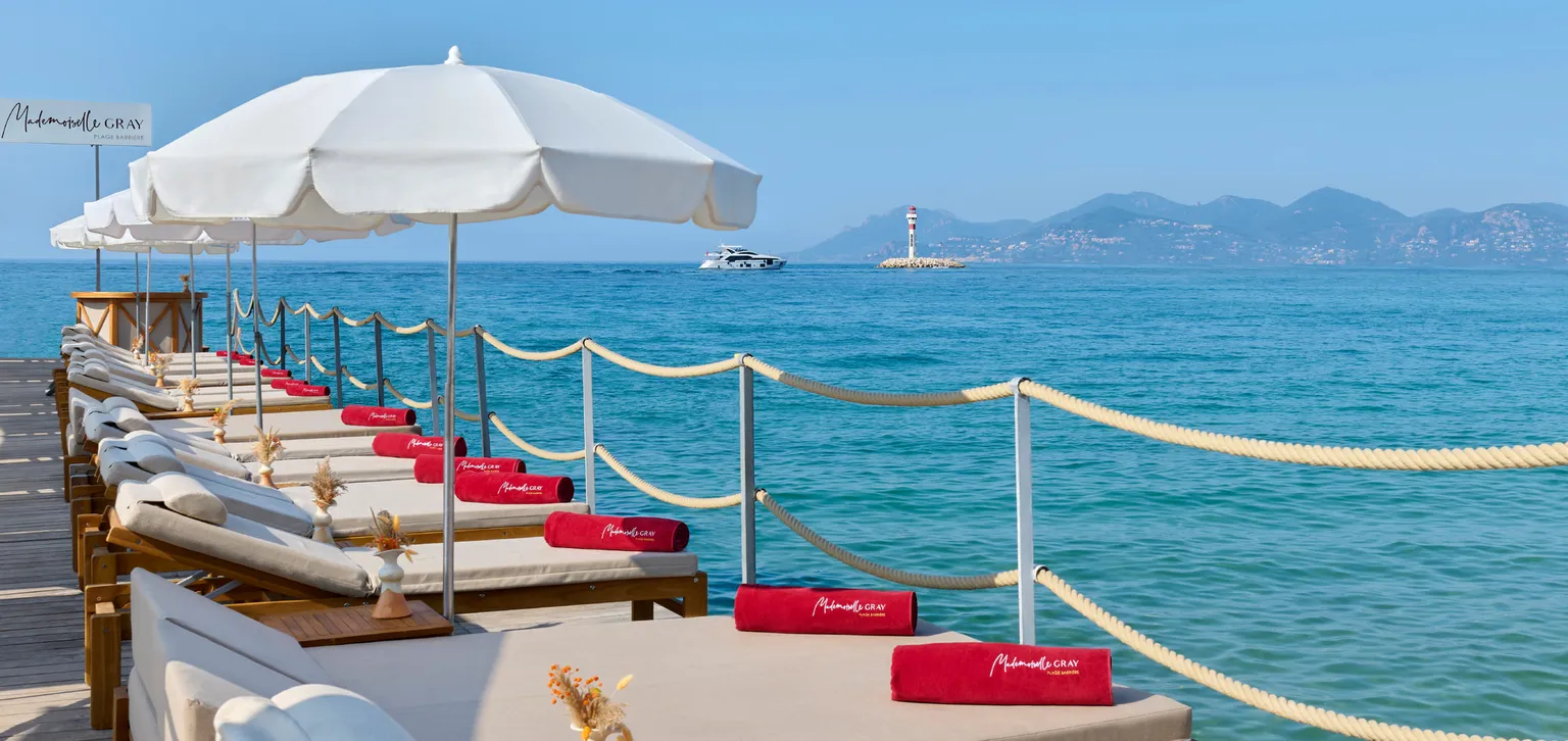 Located on the Croisette, considered one of the most beautiful avenues in France, Mademoiselle Gray's private beach lets you enjoy the Mediterranean coastline in exclusive surroundings and optimal comfort.